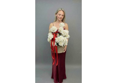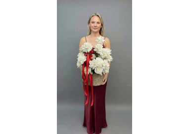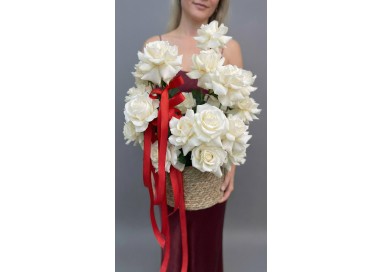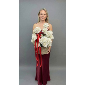 A sophisticated basket of premium white roses adorned with flowing red satin ribbons. Pure, timeless, and graceful — perfect for weddings, anniversaries, or refined romantic gestures.