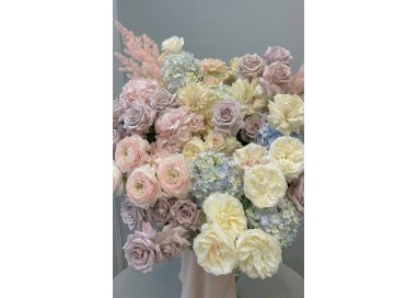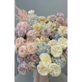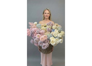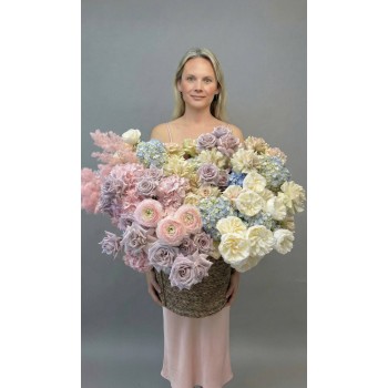 An exquisite oversized basket arrangement of blush and lavender roses, creamy garden roses, soft pink ranunculus, hydrangeas in pastel blue and blush, and delicate seasonal accents. Voluminous, artistic, and breathtakingly elegant.