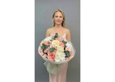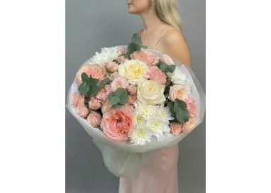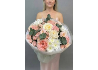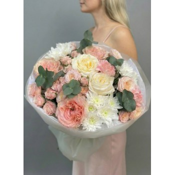 A delicate bouquet of creamy white roses, soft peach garden roses, spray roses, white chrysanthemums, and eucalyptus. Romantic, fresh, and perfectly balanced in a light, airy wrap.
