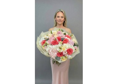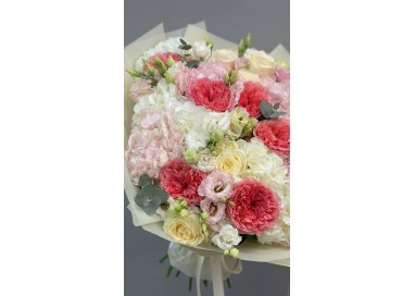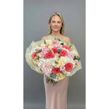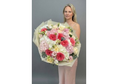 A lush bouquet of coral garden roses, soft pink and white hydrangeas, delicate lisianthus, and creamy roses with eucalyptus accents. Romantic, voluminous, and full of texture — a true statement of elegance.
